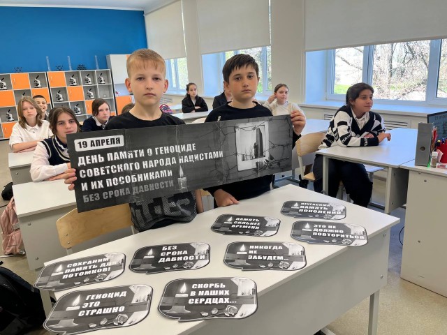 19 апреля - это День памяти о геноциде советского народа нацистами. В преддверии этого дня в 5 классе прошел Всероссийский урок - «Без срока давности», который посвящен Дню единых действий в память о геноциде советского народа нацистами и их подсобниками в годы Великой Отечественной войны. Эта дата напоминает нам об одной из самых главных страниц в истории нашей страны. Ребятам было рассказано о концлагерях Германии, в которых сотни тысяч людей были загублены фашистами .