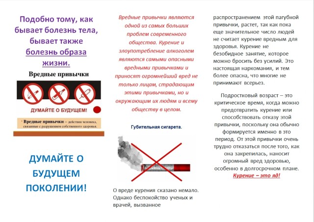 Акцию по профилактике наркомании, употреблению ПАВ и формированию у обучающихся установок на здоровый образ жизни провели волонтеры МБОУ Суховской СОШ «Дорогою добра». Целью данной работы является создание условий для формирования активно-отрицательной позиции по отношению к наркотикам и вредным привычкам у школьников. Для учащихся 11 классов были выпущены информационно-агитационные буклеты на тему «Думайте о будущем поколении».